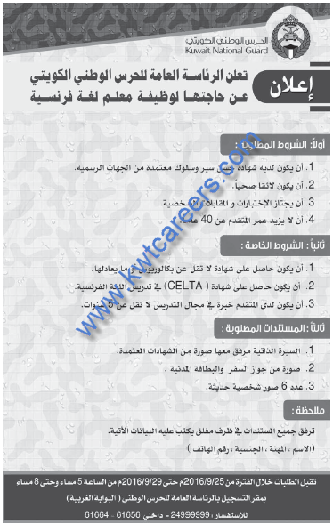 تعلن رئاسة الحرس الوطني الكويتي حاجتها لوظيفة معلم لغة فرنسية الخميس 22 9 2016